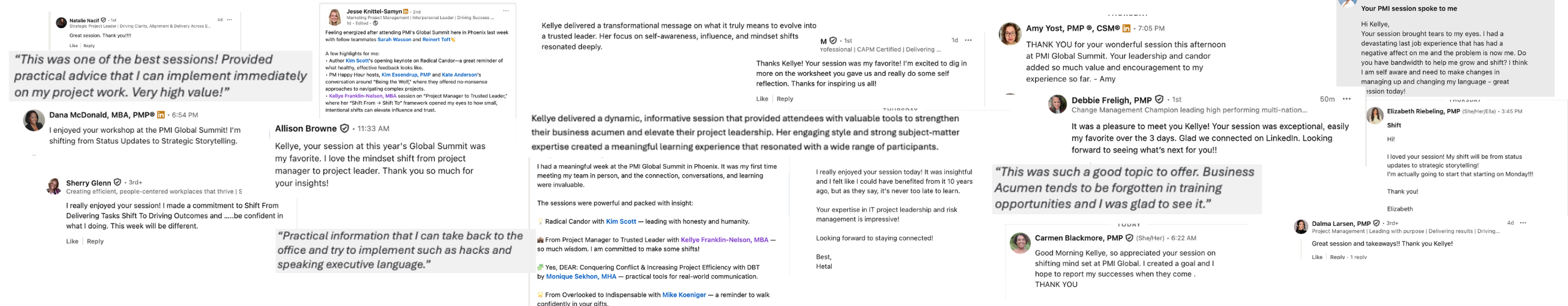 Kellye has graced the stage at events such as the PMI Global Summit, National Conference on Student Life, PMI Central Ohio Chapter’s Professional Development Day, Western Museum Association Annual Meeting, Fearless Women Summit Seattle, Lockheed Martin’s Program Manager Development Program Graduation and Summit, Ultimate Therapist Business Summit, Black Women in Science and Technology Career Fair and Networking Event.